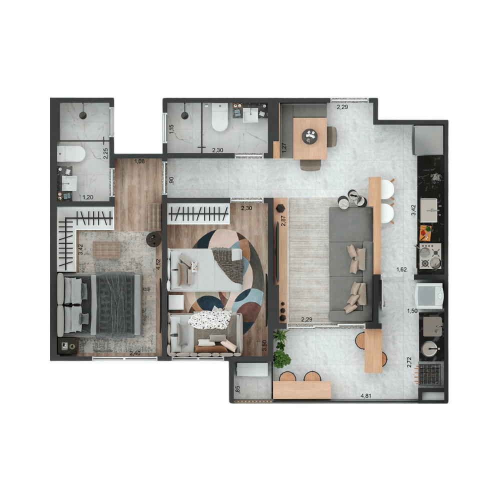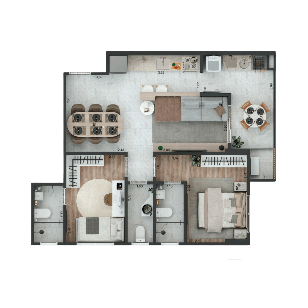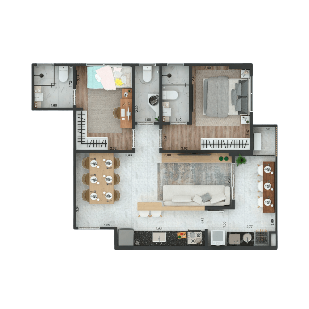 1 SUÍTE E 1 DORMITÓRIO + LAVABO